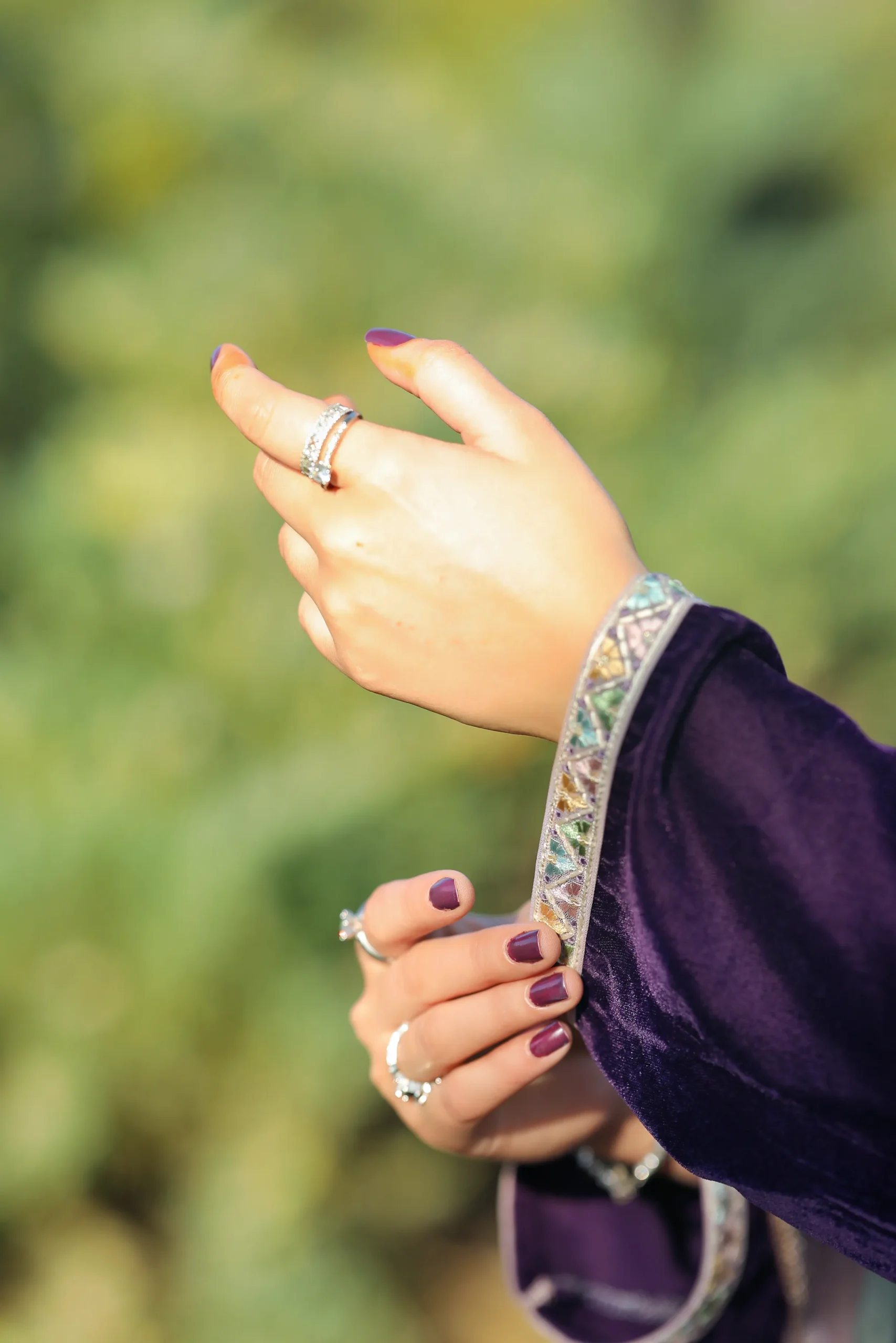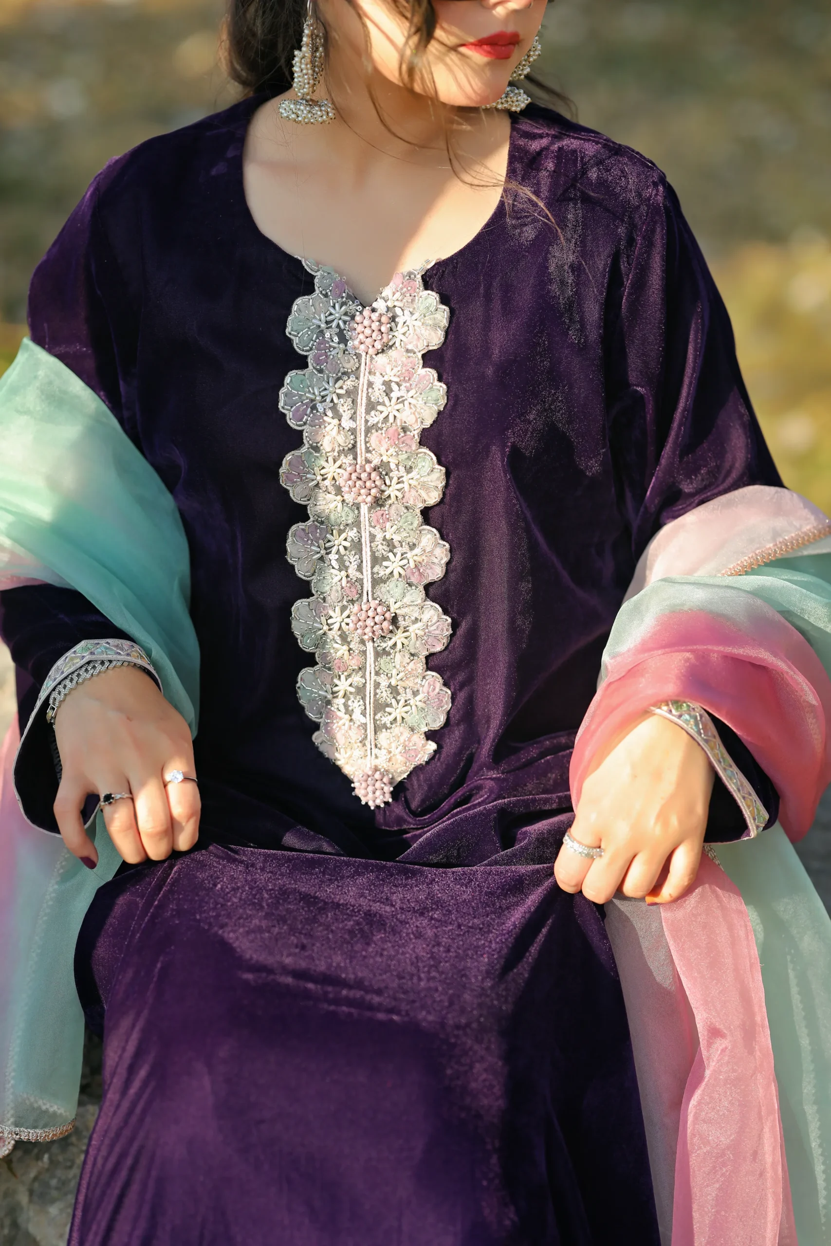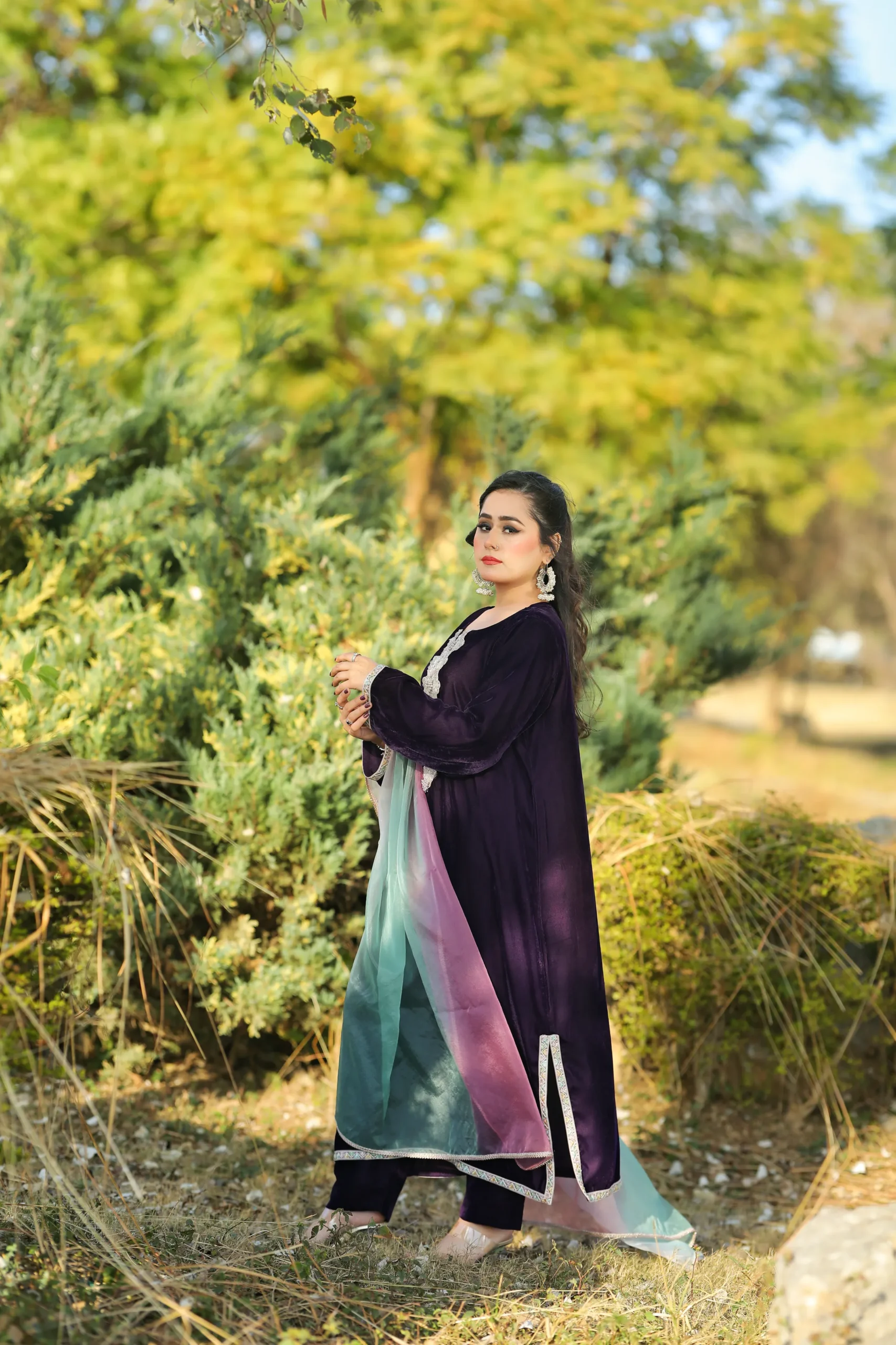 Elegant Velvet 3-Piece Dress in rich deep purple color, beautifully enhanced with intricate embroidery on the neckline. The outfit features contrast lace borders on sleves and hem, giving it a graceful festive look. Paired with a 3-shade organza dupatta that adds softness and elegance. Perfect for winter weddings, parties, and formal occasions.